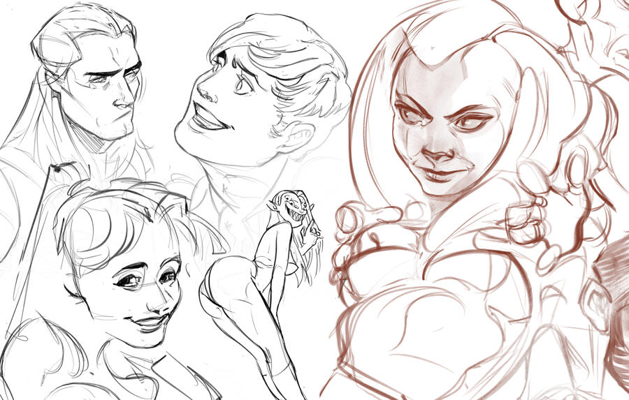 🔸One A3 page with around 5-12 black and white sketches of face and body (including a few detail shots), to figure out your OCs looks (mostly front view).